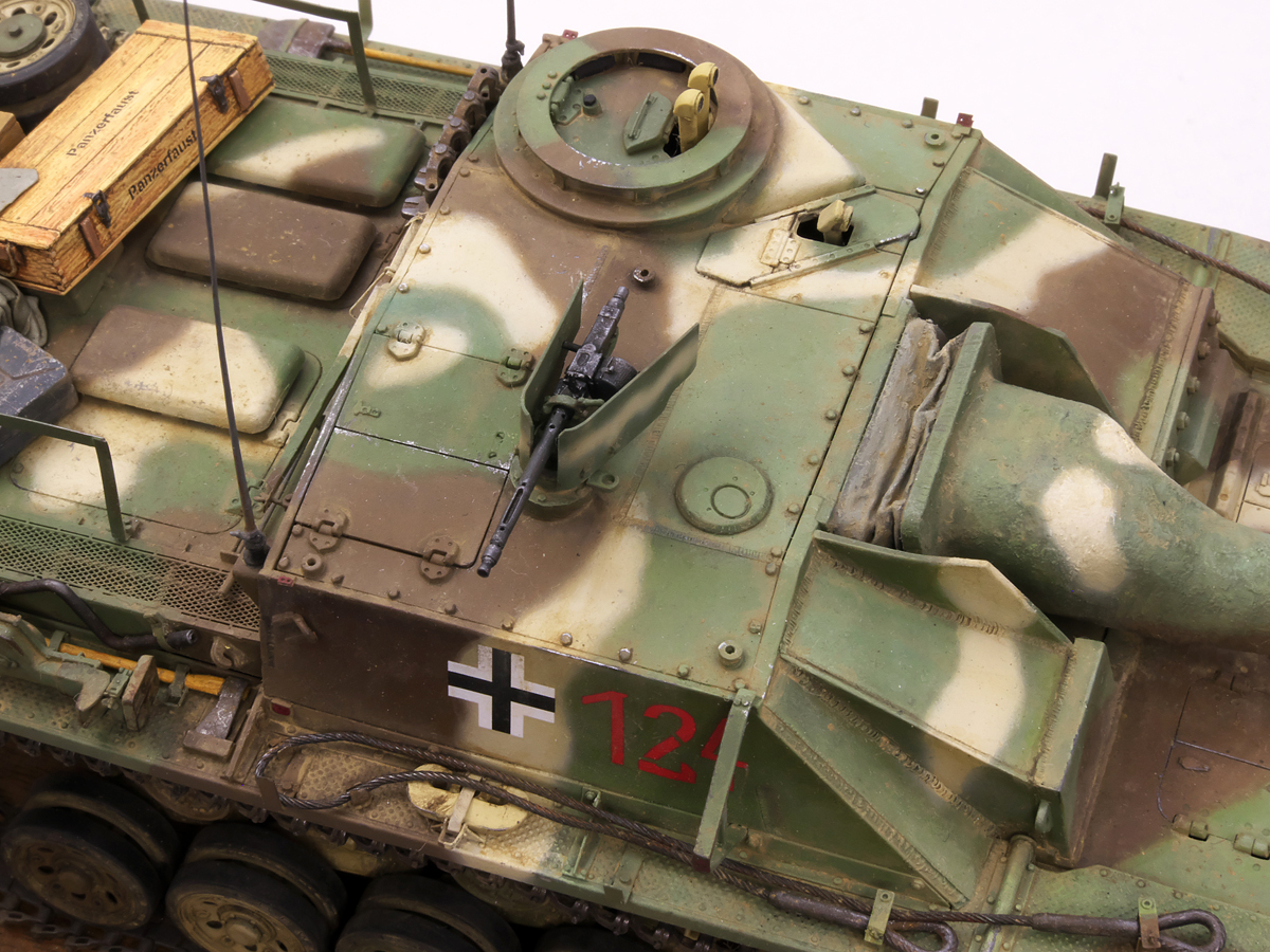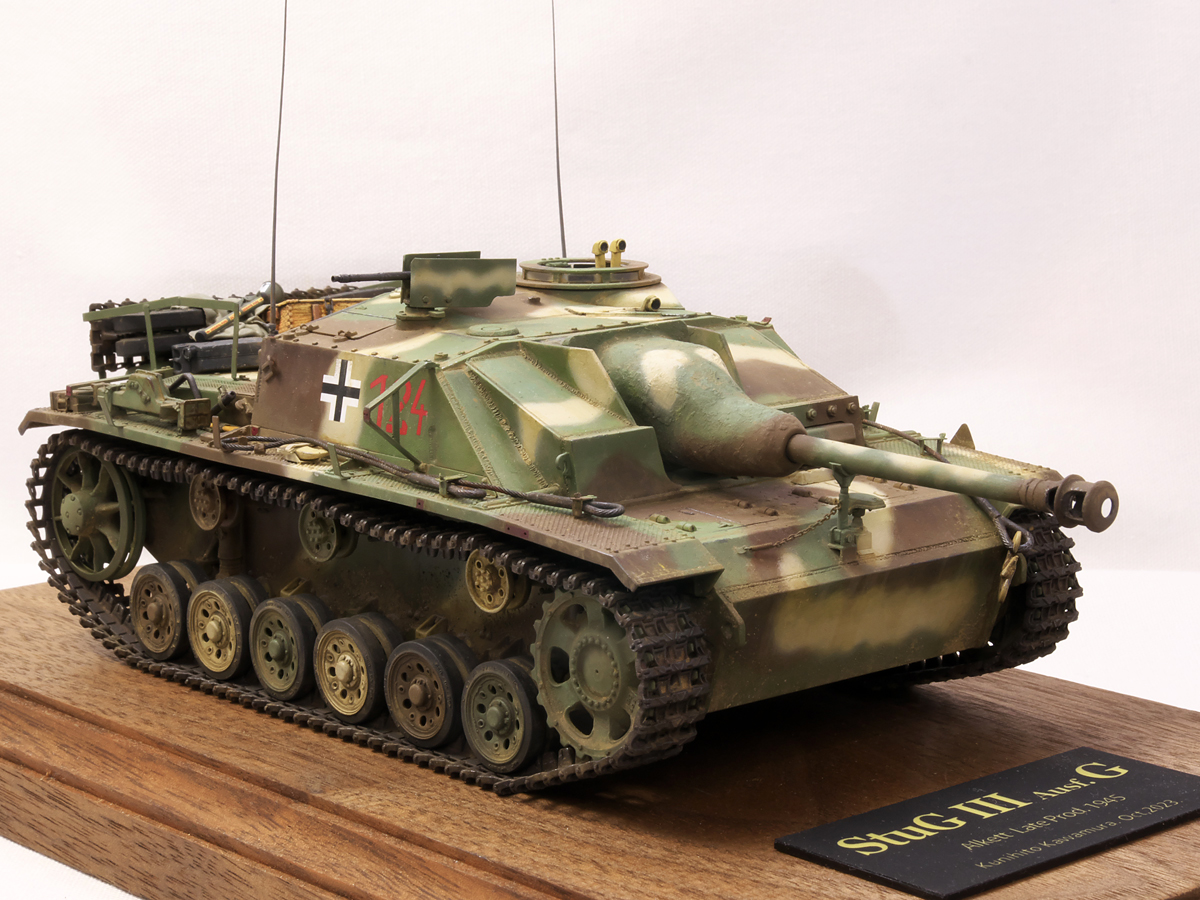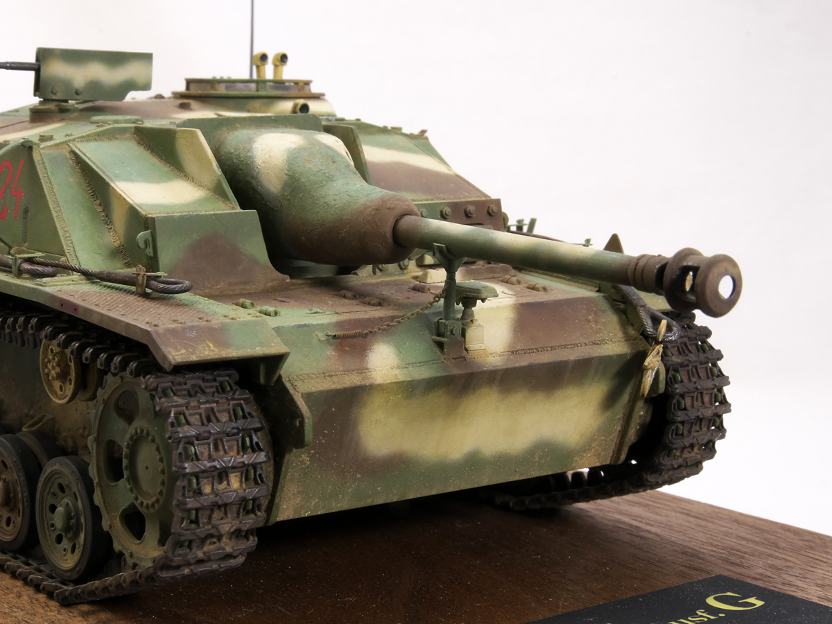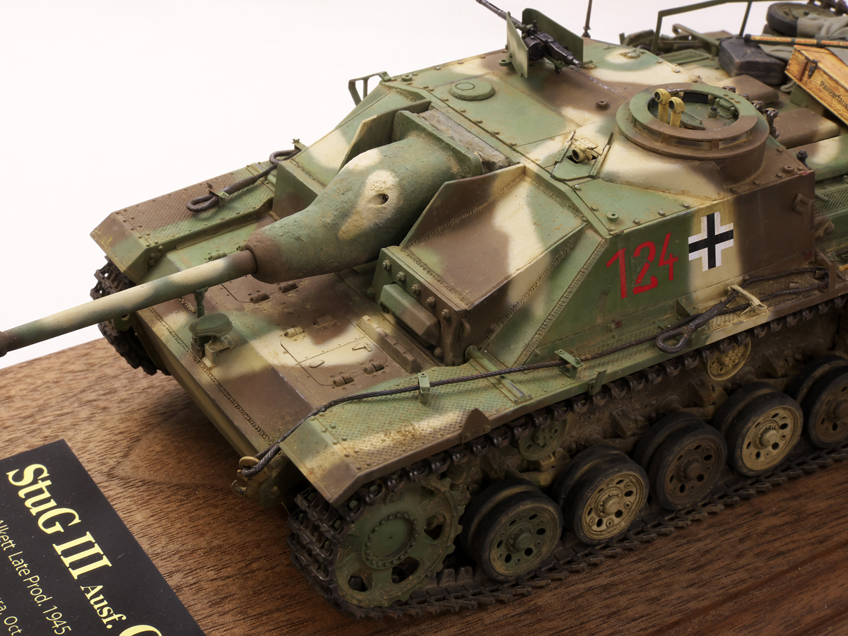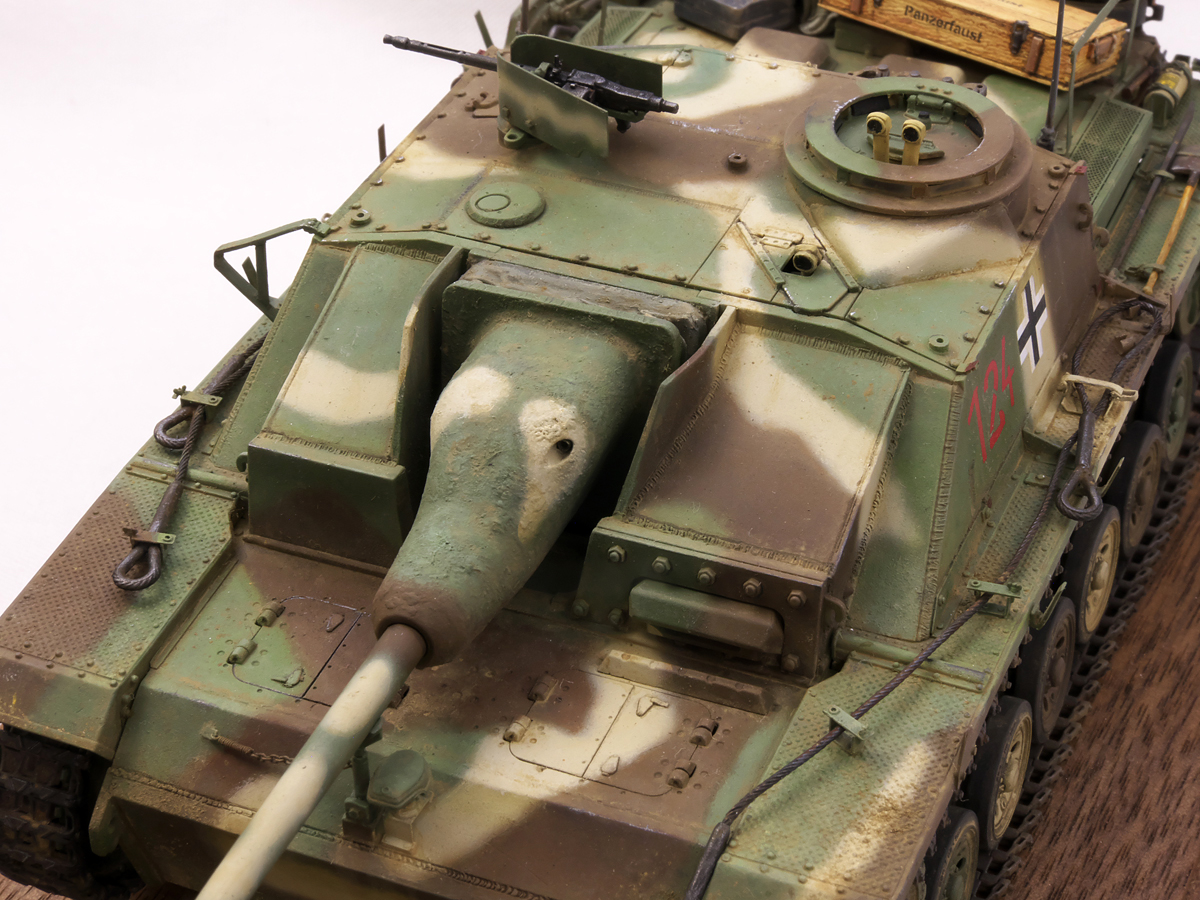 大戦末期のドイツ戦車は撃破された写真が多くちょっと虚しさがあるので、今作では生きている状態でこれから戦闘に向かうフル装備の様子を再現してみました。イエローの面積が少ないグリーンベースのカラースキーム、赤いバルケンクロイツなど、終戦間際に生産された最末期仕様の突撃砲を楽しんでみました。