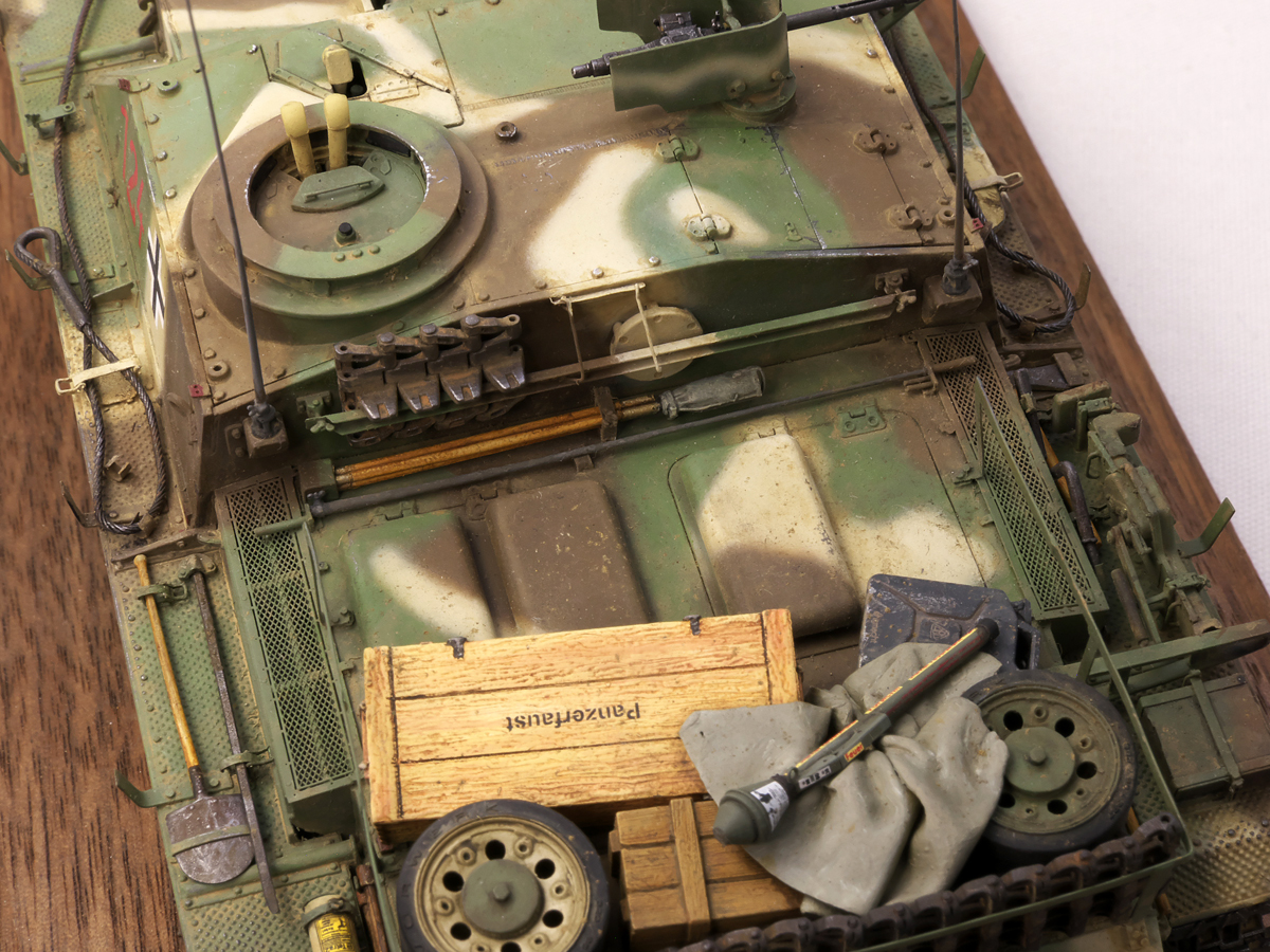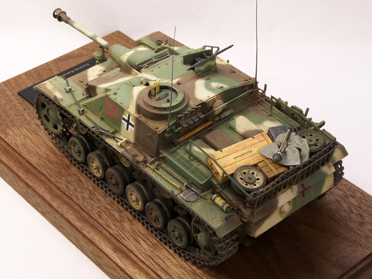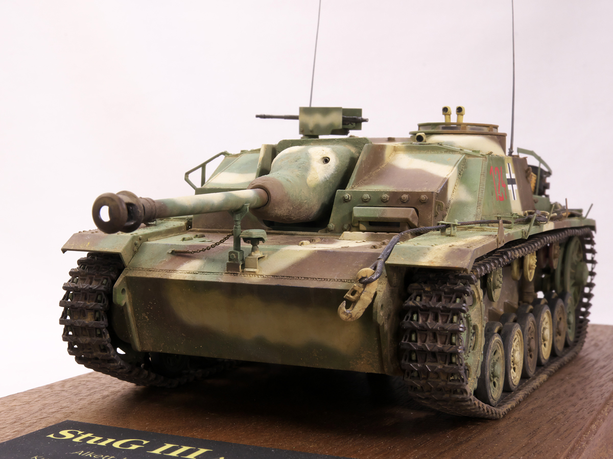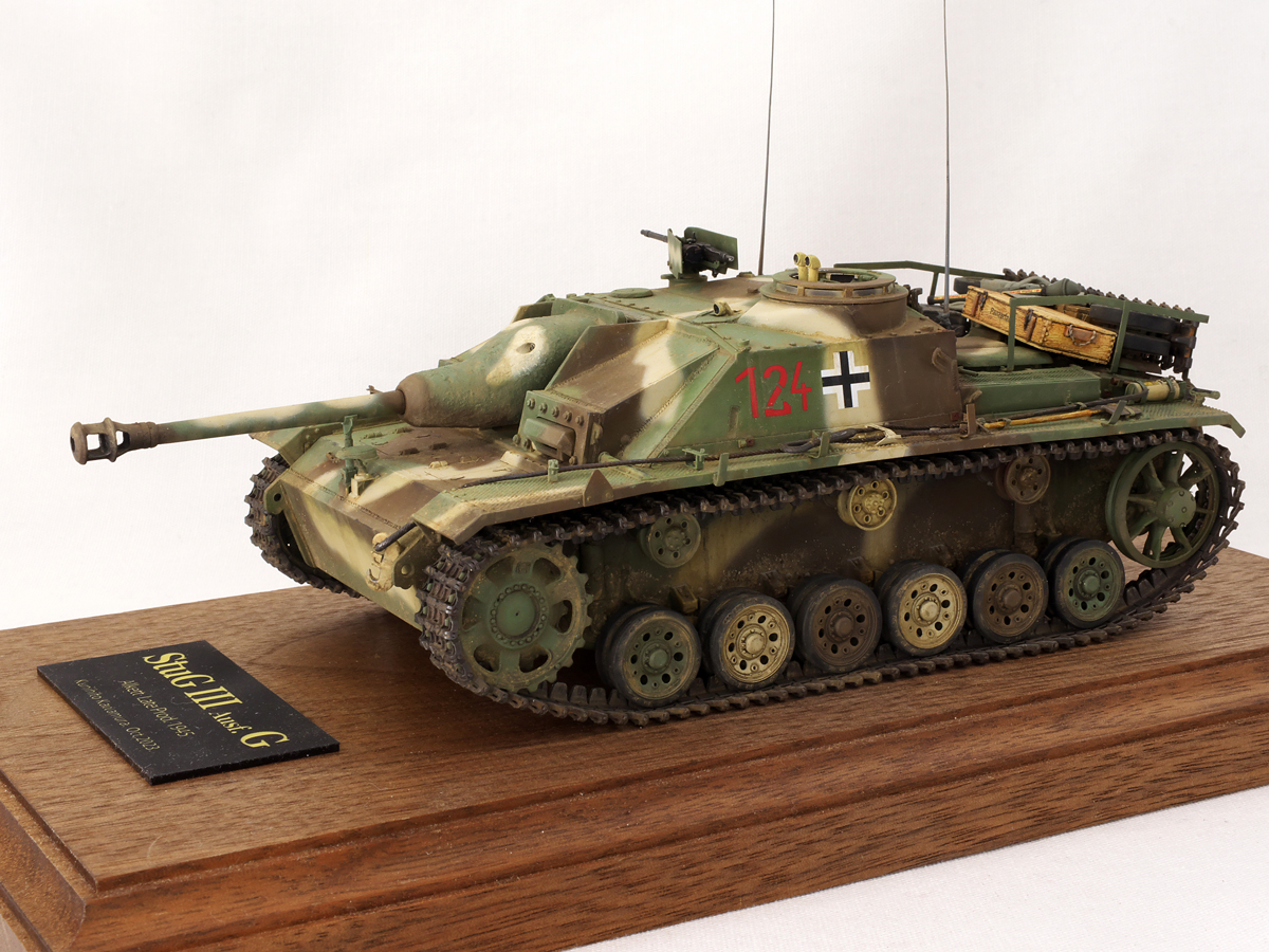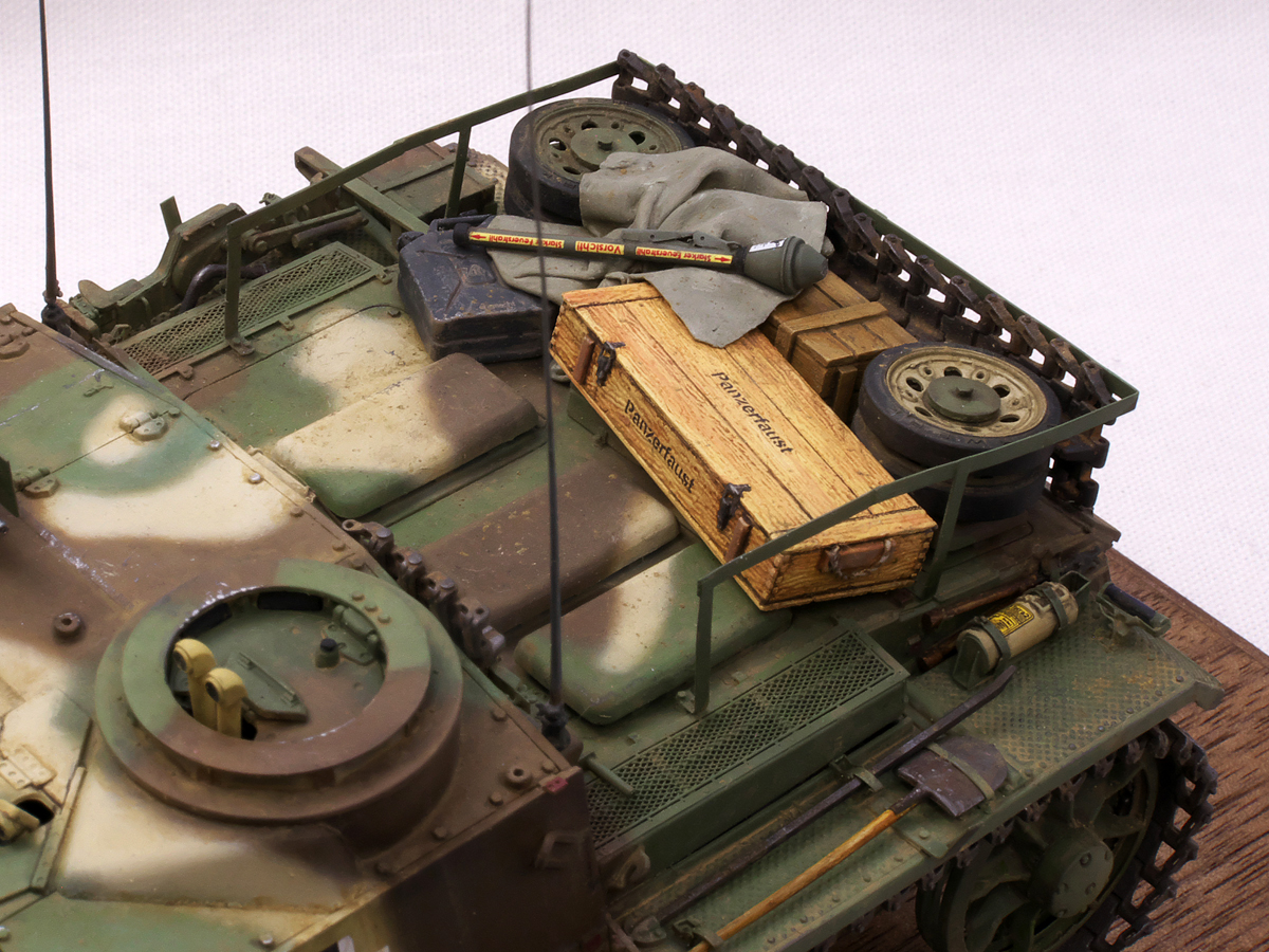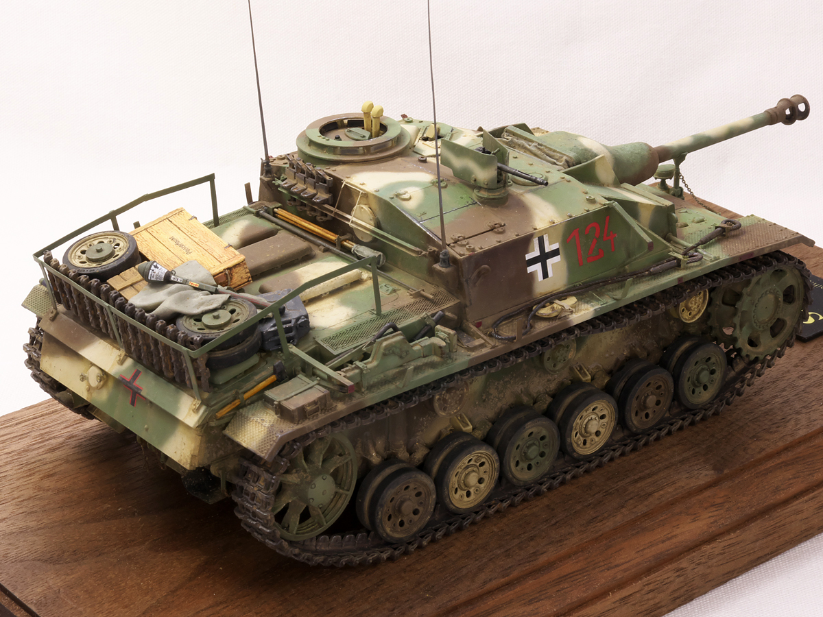 大戦末期のドイツ戦車は撃破された写真が多くちょっと虚しさがあるので、今作では生きている状態でこれから戦闘に向かうフル装備の様子を再現してみました。イエローの面積が少ないグリーンベースのカラースキーム、赤いバルケンクロイツなど、終戦間際に生産された最末期仕様の突撃砲を楽しんでみました。